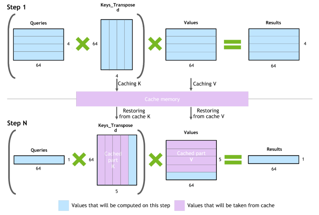 Step 1:正常的Attention計(jì)算,之后將K矩陣和V矩陣的結(jié)果緩存下來KcacheVcache。