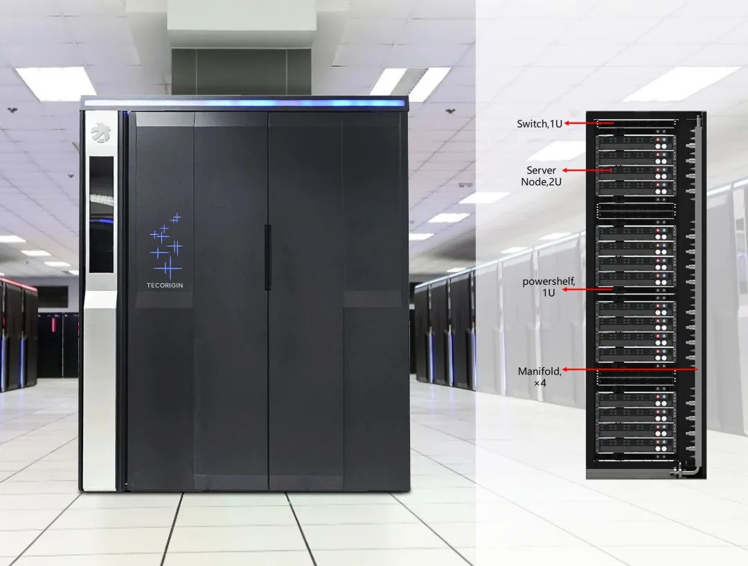 太湖之光A+ 預訓練集群(智能超算系統(tǒng))以太初元碁系列智能加速卡為基礎(chǔ),聯(lián)合浪潮信息共同打造高密液冷智算服務器。單個機柜算力達到40P智能算力,算力密度國內(nèi)最高,采用集中式供電,單機柜功耗達100KW,于2024年第二季度完成交付。