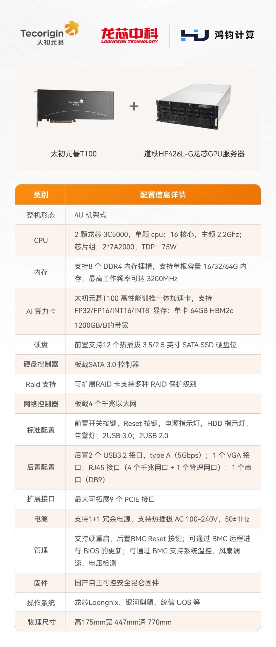 算力,作為數(shù)字時代的核心引擎,其戰(zhàn)略價值日益凸顯。面對逐步增長的信息安全需求和技術(shù)封鎖挑戰(zhàn),市場對國產(chǎn)自主GPU的期待空前高漲,一場以國產(chǎn)芯片為核心的算力革新正蓬勃興起。當(dāng)合作伙伴鴻鈞計算創(chuàng)始人提出“必須有中國‘芯’的高端算力服務(wù)器”的愿景時,太初的技術(shù)積累與深圳高效的產(chǎn)業(yè)鏈生態(tài)產(chǎn)生了強(qiáng)大共鳴,從芯片設(shè)計到整機(jī)組裝,一臺搭載龍芯CPU和太初GPU的AI服務(wù)器——道秩HF426L-G龍芯GPU服務(wù)器就此誕生。
