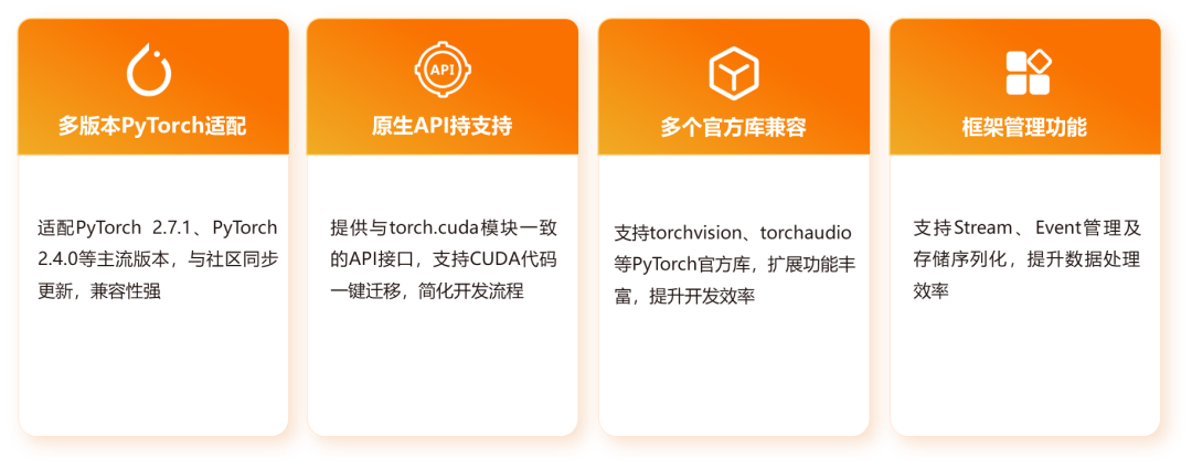 多版本PyTorch適配:適配多個PyTorch主流版本,如:PyTorch 2.7.1、PyTorch 2.4.0、PyTorch 2.0.1等,與社區(qū)同步更新,兼容性強。