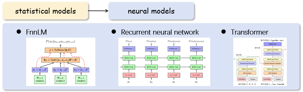 圖2 基于統(tǒng)計(jì)的語(yǔ)言模型和基于神經(jīng)網(wǎng)絡(luò)的語(yǔ)言模型