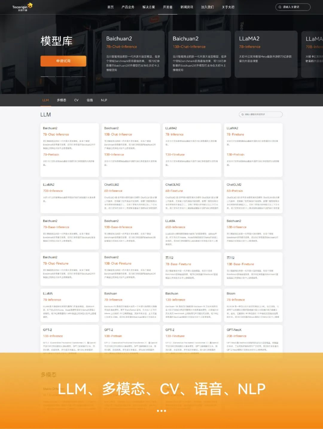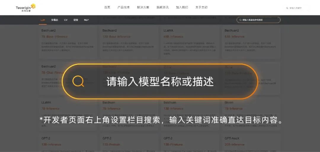 為匹配不同開發(fā)者的個性化需求,提供更多實用信息,頁面聚合"LLM"、"多模態(tài)"、"CV"、"語音"和"NLP"五大應(yīng)用場景,顯示太初加速卡目前支持運行的模型庫,并詳細(xì)展示每個模型的功能特性、優(yōu)勢及技術(shù)規(guī)格等,滿足來自不同行業(yè)、企業(yè)的開發(fā)者在不同場景下的模型應(yīng)用需求。