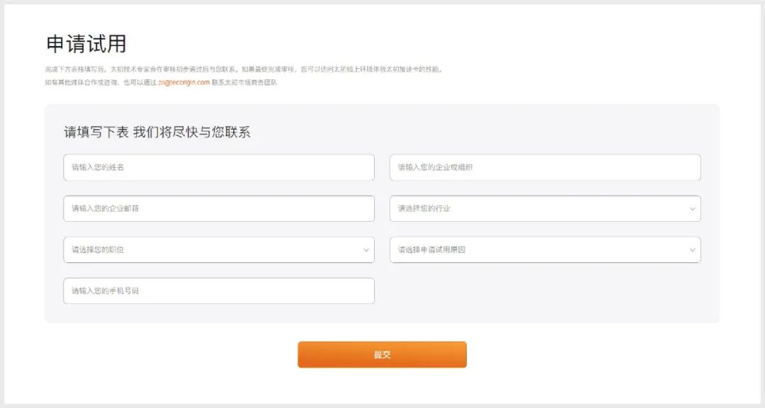 為進(jìn)一步提升用戶體驗并提供更個性化的服務(wù),官網(wǎng)面向個人開發(fā)者、企業(yè)開發(fā)者、企業(yè)用戶以及生態(tài)合作伙伴推出了申請試用功能。只需填寫簡單的表單信息,即可輕松獲取您感興趣的太初全棧產(chǎn)品內(nèi)容,便捷體驗太初全棧功能和服務(wù)。