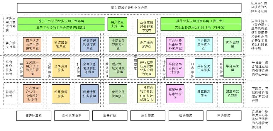 超算互聯(lián)網(wǎng)是指基于多個(gè)國(guó)家級(jí)超級(jí)計(jì)算中心的資源,通過(guò)高速網(wǎng)絡(luò)實(shí)現(xiàn)資源的互聯(lián)互通與資源共享,形成國(guó)家高性能計(jì)算核心資源網(wǎng)。其上集成了研發(fā)資源管理與任務(wù)調(diào)度軟件,形成領(lǐng)域應(yīng)用平臺(tái)搭建技術(shù)體系。并在復(fù)雜力學(xué)體系與量子物理體系、生物與材料、環(huán)境治理與災(zāi)害防治等多個(gè)重點(diǎn)領(lǐng)域進(jìn)行應(yīng)用資源集成與服務(wù)集成,建設(shè)領(lǐng)域應(yīng)用平臺(tái)并開(kāi)展應(yīng)用示范,為國(guó)家實(shí)驗(yàn)室等大型研究機(jī)構(gòu)提供以數(shù)值模擬為主、兼顧數(shù)據(jù)分析和智能計(jì)算的科研基礎(chǔ)設(shè)施服務(wù)。